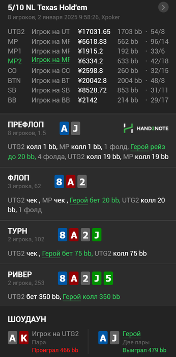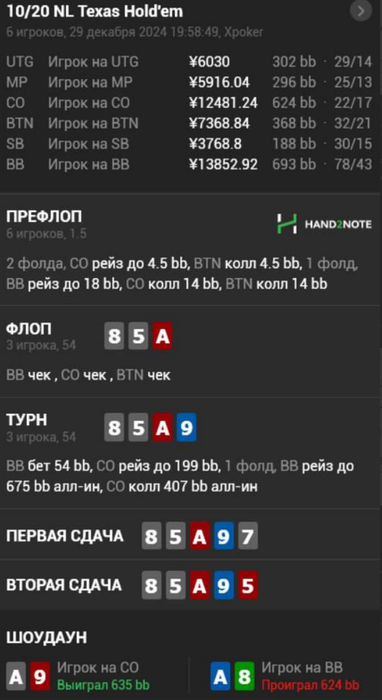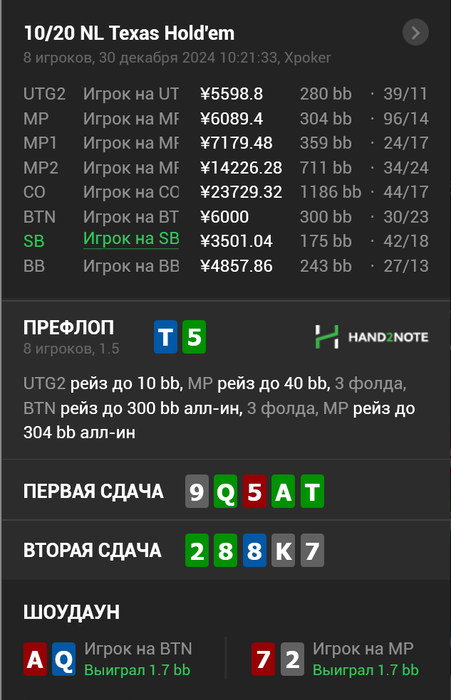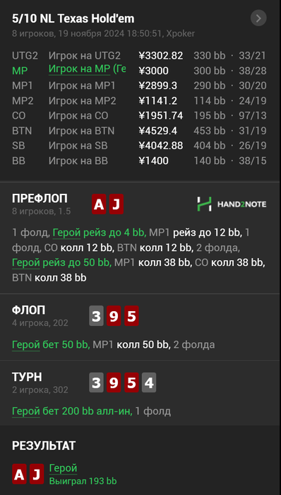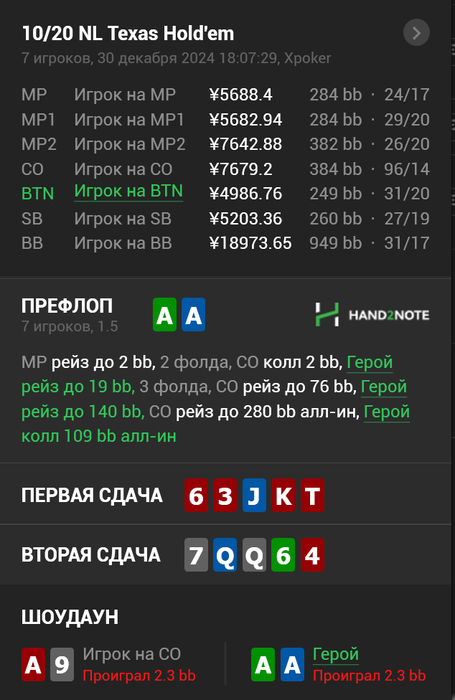 В канун нг на нл200 пришли поочерёдно два отважных любителя с инстадокупкой в 300бб. Со вторым удалось сыграть побольше, сел он в классический 8-макс на пару сессий нл220-440 с лр -800бб/100, последнюю из которых закончил лесенкой лимитов в ХА с регом на 2к, успешно залив ему 15к за пол часа игры. Желающих составить компанию в 3 утра в лобби не оказалось. На следующий день я обнаружил его уже на суши столе нл220. Кто не знает, в такой игре перед первой раздачей формируется допбанк по 5бб с каждого, который висит над SB. В случае единоличной победы SB в раздаче помимо основного пота он забирает эти общие 40бб, и формируется новый суши банк, если же SB не выигрывает раздачу, то докидывает в сушибанк еще свои 3бб и теперь над новым SB висит уже 43бб, моментами этот сушибанк разгонялся до 80бб. Прикинув хуй к носу, не ожидая возвращения кита на рег столы, и обдумав стратегию было принято решение пробовать, думаю мало кто из нас сидел за столом несколько дней подряд с таким отважно заливающим китайским бизнесменом, поэтому часть профита от участия с ним была выделена на шот. Уровень диспы жёстче сложно представить, последняя сессия на нл440, мегадипы почти со всеми за столом, SB вынужден биться за каждый банк, любитель воюет за эти суши в 300бб+, на каждой позиции, не имея паса префлоп, на постфлопе кроме потбета ставок от него нет, изолэйты по 100бб за столом и несколько потов по 1кбб+. Повезло унести ноги из суши в небольшом плюсе, было принято решение, что ожидание хоть и огромное, но диспа просто безумная. За эти два дня я дважды обновил самый большой недобор в раздачах по 2к$+ в каждой, выиграл самый большой банк в 2,5к$ в лучших традициях уебав комбарём готовый стрит трижды, выиграл самый большой банк в ББ и впервые сидел 1кбб за столом.