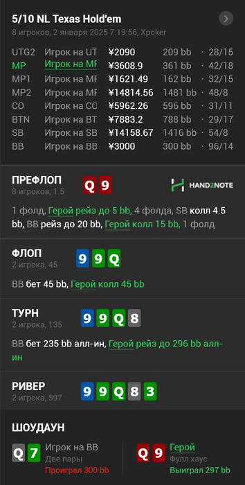 1. немало уникальных фулов у нас типа KK с зелёной, АКo и даже есть каряга. Наверное пушнуть QQ нормально тут.