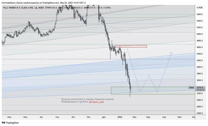 Тем более, если посмотреть техническую картину: индекс РТС находится на пограничной зоне и вероятность продолжения снижения к 1100 пунктам сейчас возрастает. Соответственно, по многим бумагам мы сможем увидеть отметки ниже. Яндекс - не исключение. При уходе ниже текущих отметок есть все шансы увидеть диапазон 2300-2500. Помимо трендовых Ганна это сильный зеркальный уровень.