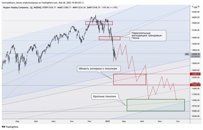 Техническая картина: После пробоя параллельных трендовых Ганна началось ускоренное падение. Считаю, что следующая остановка будет в диапазоне 12000-12300 пунктов, где также проходят трендовые.