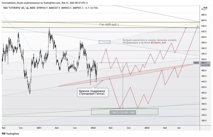 Безусловно, акции Татнефти смотрятся интересно в сравнении с рынком. К тому же, гэп в районе 650 рублей еще не закрыт и является целью. Но какой период времени потребуется для его закрытия? На графике представлены несколько сценариев возможного достижения цели.