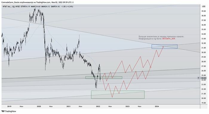 24$ - это сильный зеркальный уровень, который уже интересен для покупок. Но ниже проходит глобальная трендовая Ганна (на уровне +-21$), которая может выступить магнитом для цены. И, с бОльшей охотой, я бы прикупил бумагу именно там.