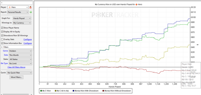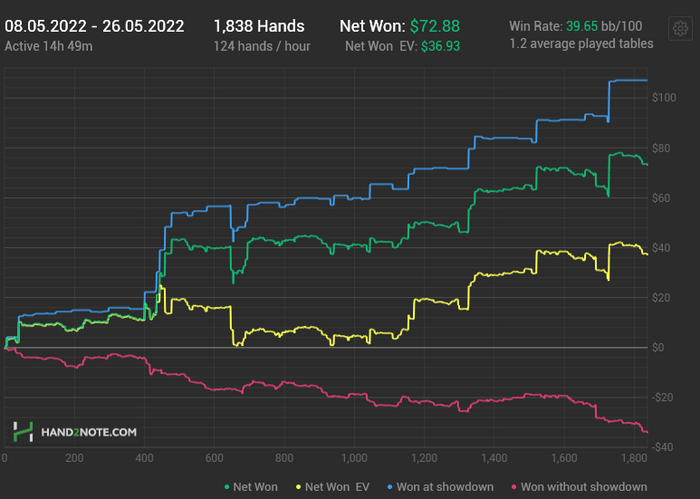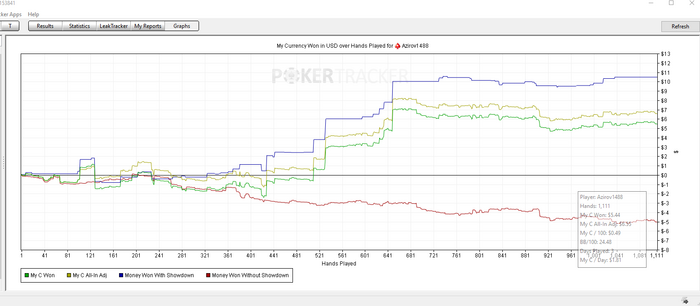 В целом неделя прошла удачно.Играл не много но в плюс. Пока не поставил себе 100% плюсовую игру не вижу смысла открывать больше 1-го стола. Учу префлоп чарты и привыкаю к хаду.