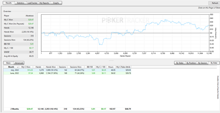 Доброго времени суток ! После майского апстрика на нл10, в июне я впав в жестокий тильт, за вечер залил весь банкролл на чико и взял 2х недельный перерыв от покера. После небольшого перерыва, немного почитав за психологию я вернулся за столы на нл2(там где банкролл уцелел)888poker. Подведу итоги игры за последних полтора месяца. Нл 2 уверенно бью с хорошим винрейтом. Нл 5 дается не так легко но все-же в плюс. Пару раз приходилось спускаться лимитом ниже.