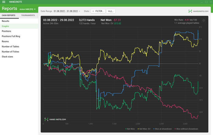 План на август: 10 к рук на нл5 и активней поработать над префлопом + побольше разборов собственной игры. Если отыграю с тем же результатом или больше 5бб\100 то возможно в сентябре пойду на лимит выше.