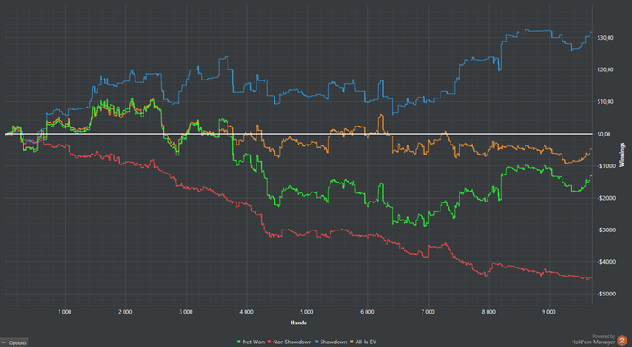 График со старта, 30к рук на данный момент в 0 катаю. Делаю вывод, что надо выкатывать больше и, очевидно, работать вне столов и убирать те лики, которые урезают мой винрейт. Причем раз за разом их делаю, но все никак из игры не уберу.