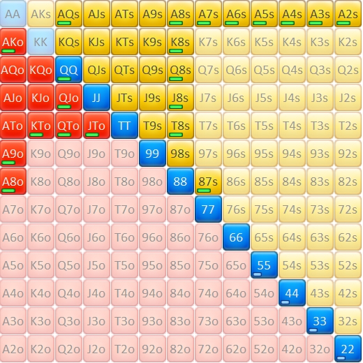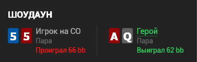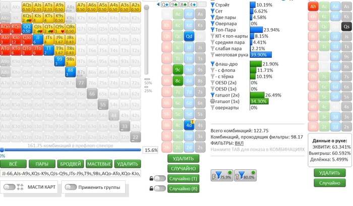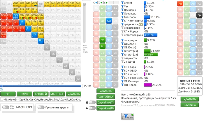 River: На ривере приходит карта, которая закрывает почти все дрова, теперь у него половина оставшихся рук усилились до стрита, у нас 29% эквити против всего его диапазона! Т.е. если убрать руки и предположить, что не все их он будет блефовать, то у нас 3% эквити.