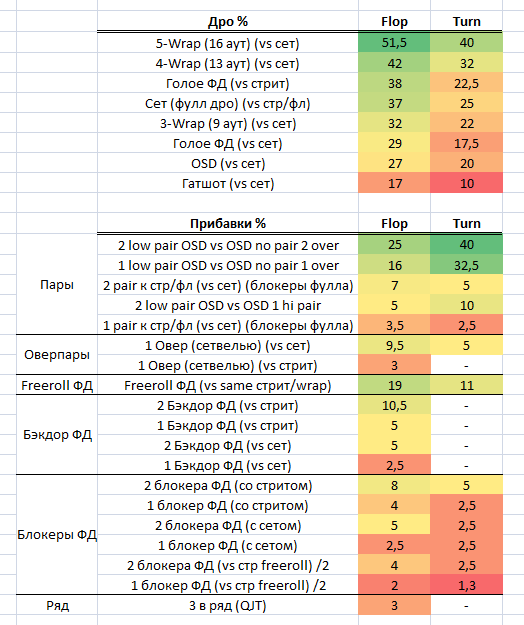 Сразу скажу, что таблица примерная и в ней можно найти "пробелы", например ФД + оверпара против сета не будут давать 29+9,5=38,5 (~35%, если нет блокеров ФД). Но в качестве ориентира можно использовать.