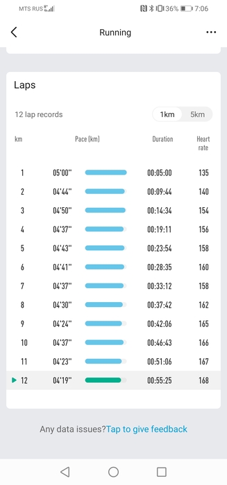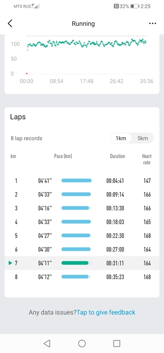 Бежал по ощущениям, почти не смотря на часы. Темп держал комфортно, только на последнем км второго отрезка начал чувствовать усталость.