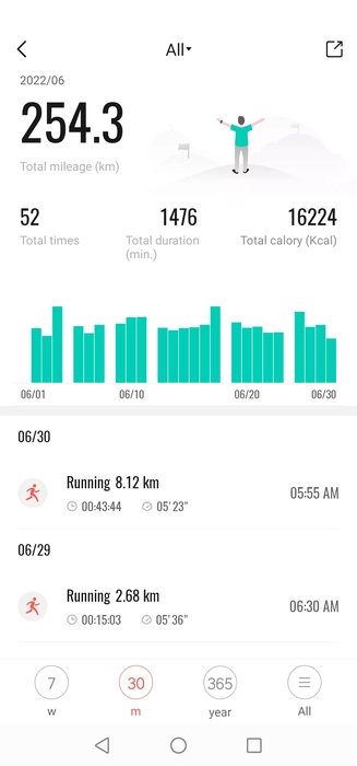 Июнь в одной картинке. 24 дня беговых, 6 выходных. Объёма получилось на 14км больше, чем планировал.