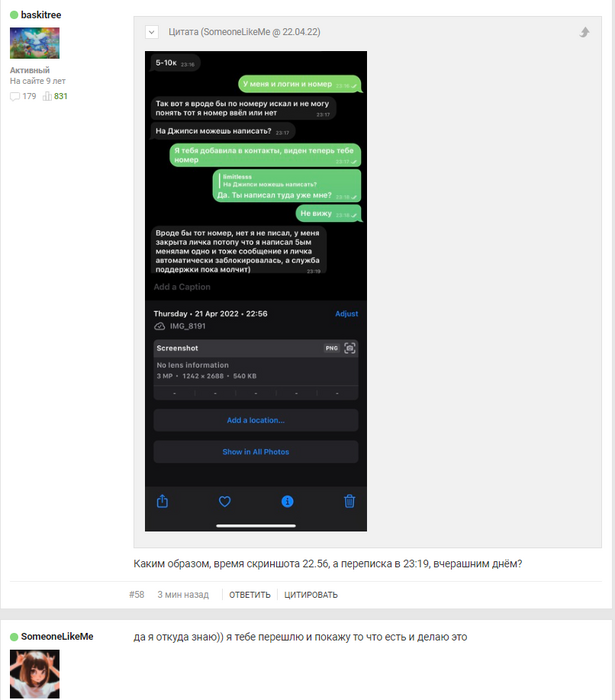 Какая мне разница, во сколько ты оправляла этот скриншот, в другой чат, когда последнее сообщение в этом чате, указанно 23:19. Получается, это не вчерашняя переписка, как ты нам тут говорила.