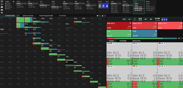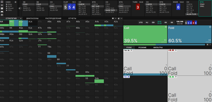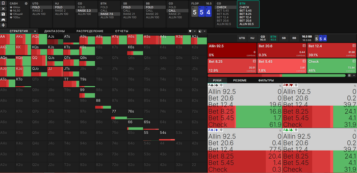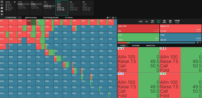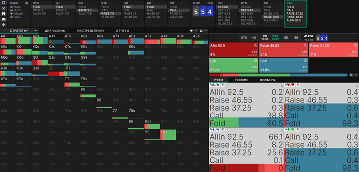 На днях посмотрел видео от GreenLine по префлоп-чартам и они там чуть более тайтовые, чем мои были, поэтому решил свои в чем-то поправить и вообще сделал красивенько всё в FZpro) теперь мне не нужно переключаться между 3x call BB, 3x 3bet BB и вот такого рода, а просто разными цветами это себе пометил (причем еще и можно соотношение цветов менять). Офигенно, красиво и понятно. То что надо.