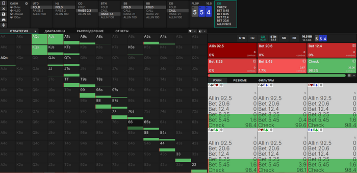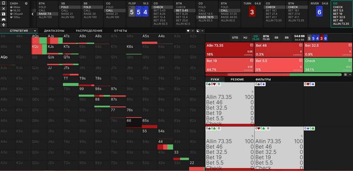 2) размер 3бета - кажется, это является основной причиной, почему солвер поставил такую низкую оценку. Уверен, в его решениях будет оптимально сыграть что-то в районе 3х рейза
