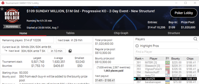 я подумал, что будет символично в это воскресенье что то занести. И решил сыграть по крупному, т.е по потолку моей загрузки, загрузил Bounty Hunters Sunday Main Event $52.50, $500K GTD (GGNetwork), удалось отобраться со второй попытки через сателлит в мой первый SM. И вроде вначале все складывалось довольно позитивно, но по итогу красивой истории не вышло.