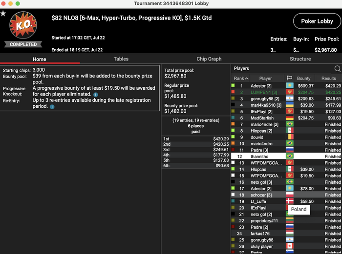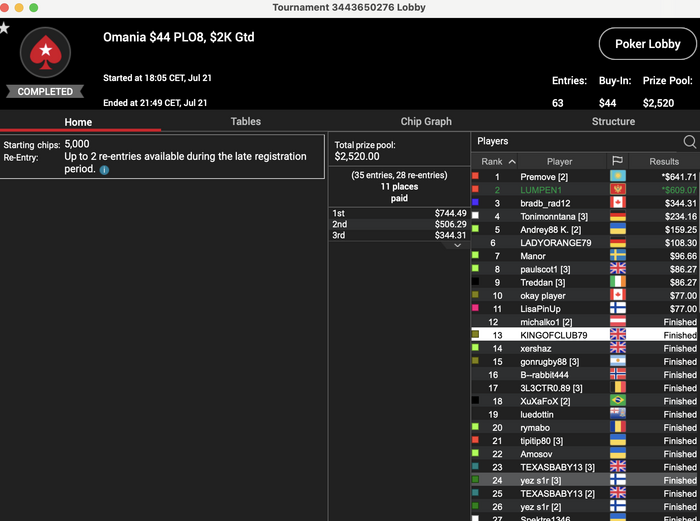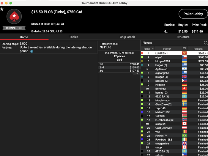 В любом случае, желание катать есть, чего нельзя сказать о самой игре, даже больно такое наблюдать, как 82$ гипера от раза к разу не собираются, 215$ в среду вообще мне казался турниром-любимчиком для многих и тот последнюю неделю не собрался и в принципе уже не удивляешься таким делам. А про 215 понедельника и пятницы вообще молчу.В целом причины понятны.Могу только в очередной раз респектнуть Мамычу, что регается всегда в них.
