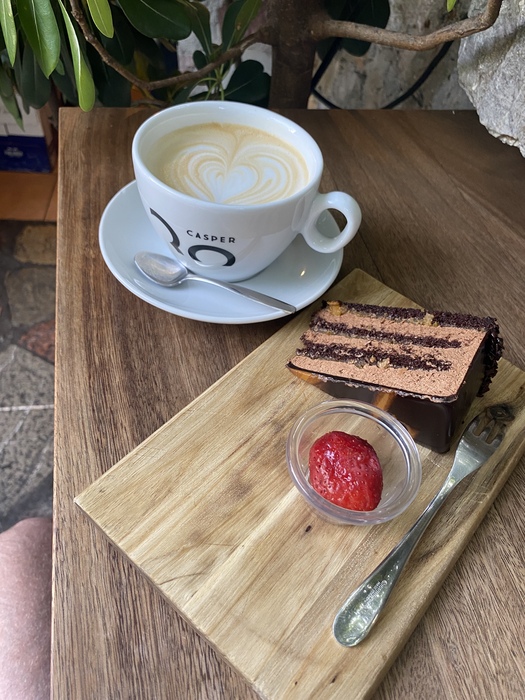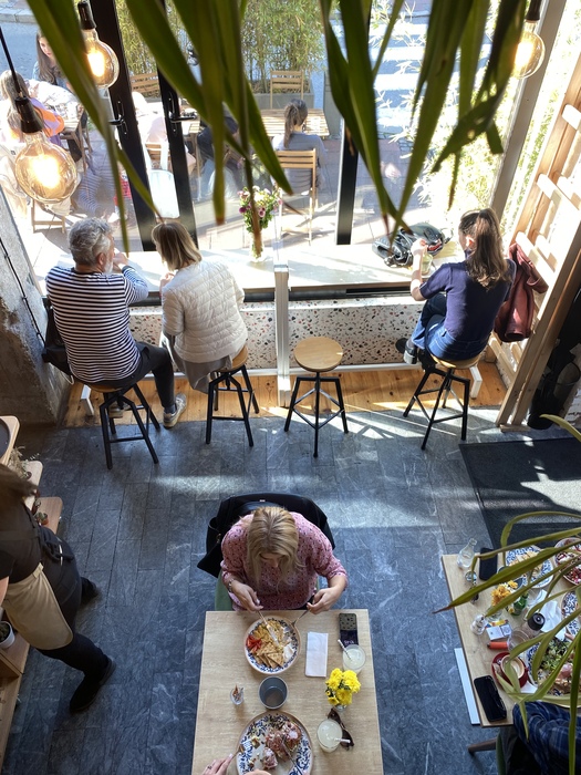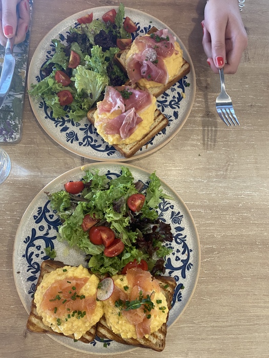 Место называется Bloom (хаха сразу подумал Виктор, ох уж этот покер)Открытая кухня,приятная музыка и вид из окна,правда очень вкусно и по сравнению с чг дёшево. На двоих вышло 16€ (Тосты с лососем, пршут, салаты,кофе)