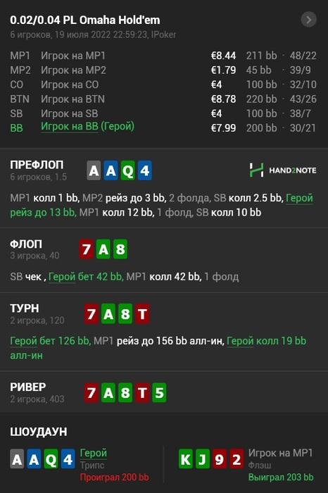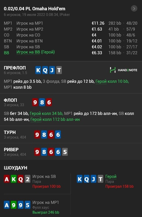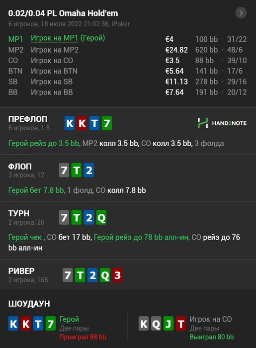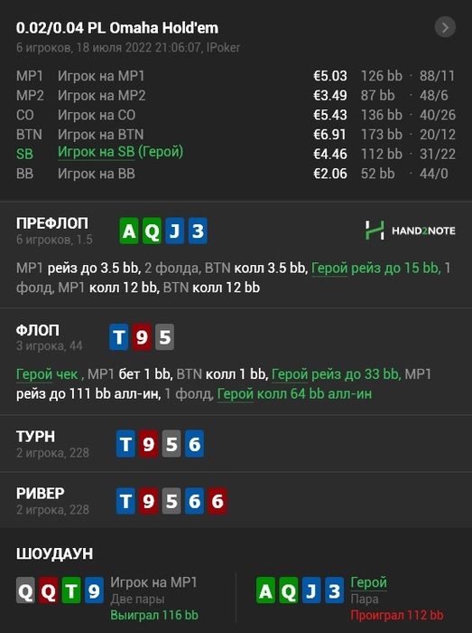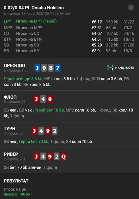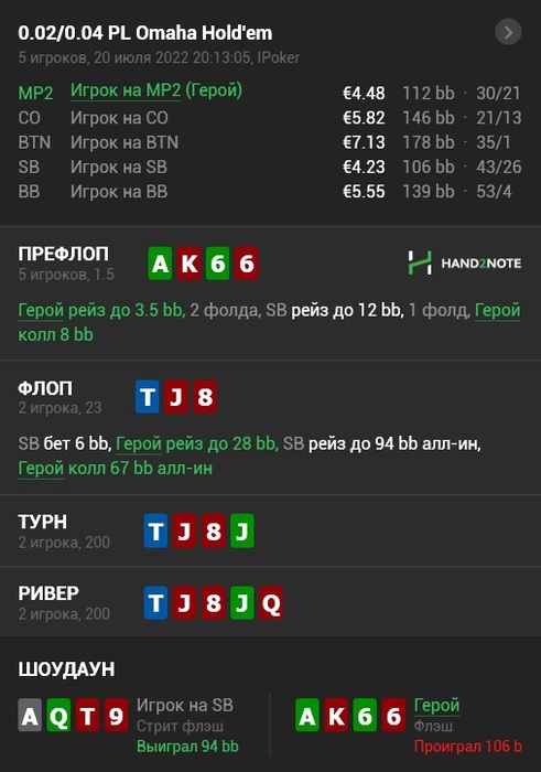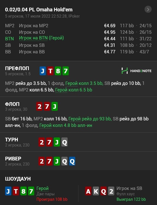 IKnowTheRiverCard, О привет со дна нанолимитного болота! Смотрел с вами интервью про Бали. Как я понял, коллега, дорого богато играете. Приму за истину вашу помощь, благодарочка! В последних двух раздачах вопросы в основном про сайзинги. Я просто в любой непонятной ситуации ставлю пот и пусть теперь думает опп. Вроде с топ двумя на мокрой доске в мультивее без бэкапа-это не игра на стэк. Но это же аж целых 2, да еще и топ пары-здесь нет отскока, впаялся так впаялся.