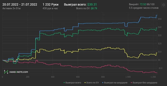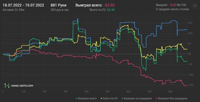 Сегодня играл в таком психологическом состоянии примата, что не мог заставить себя перестать блефовать где ни попадя. Везде либо вскрывали, либо заслуженно давали по шапке. 2 раза делал большой перерыв из-за этого. Не помогло, продолжал пихать не в ту сторону. Крайне недоволен собой, играл как дно. Еще работать и работать над дисциплиной.