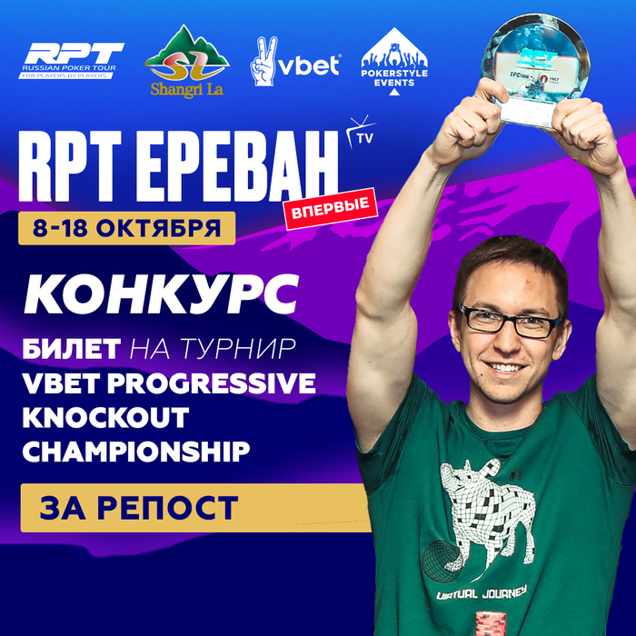 🎁 В этом конкурсе мы разыграем билет в турнир Vbet Progressive КО Championship - один из самых массовых ивентов RPT c байином $170 и гарантией $50,000, который будет открывать октябрьскую серию в Ереване.