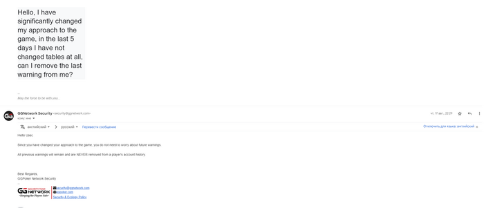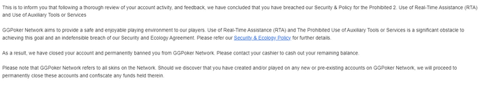 После того как я неудачно попробовал перейти в омаху , я с июня начал катать рейкгонки на ГГ на 25 и 50, ник Goko D Jambo , все кто катают эти лимиты плюс минус должны были меня видеть, суммарно с июня у меня гдето 9к профита, у меня на компе есть гто+ , флопзила , симпл, х2н и наверное в разное время какие то из этих программ или разные сочетания этих программ могли быть включены во время катки , часто был включен эксель и браузер конечно , но я хз можно ли их вообще открывать или нет. Понятно что во время катки я их не использовал , у меня не такой мощный комп чтобы солвер мне во время катки на 9 столах споты считал за секунды, но я не отрицаю что они могли быть когда то включены. Моему другу прилетало 2 репорта за использование корпоротивного софта для обещния и он просто закрывал его и перезагружал комп , мне же никакого страйка не прилетало, я бы понял если бы мне прилетел бан за бамхант , так как я мог случайно выйти со стола , например когда нажимал уйти со всех столов или последние 3 дня я катал по часу и просто все закрывал , но RTA , я даже вообще не знал что такое существует. Читал похожие баны только на AoF , в кеше похожих ситуаций не видел