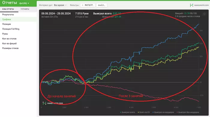 Занимаемся с Ильёй на постоянной основе уже почти месяц. На занятиях разбирали наигранную базу, разобрали по пунктам мои ошибки, Илья указал на то, как надо действовать в различных ситуациях на определённых досках, посмотрели раздачи. Рекомендую.