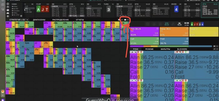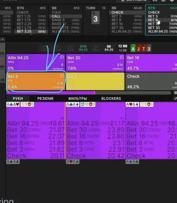 Пачка бесплатных советов: 1. Защищайте беты, а не чеки. 2. Бетайте на скип с безумной частотой мелких-средних сайзов. Даже 50% это все ещё мало. 3. Не нужно нихуя балансить, если вы понимаете что происходит в спотах, у вас тонна балансов будут выстраиваться под логику страты, и не для того чтобы нас не могли эксплойтить, а потому что это очень плюсово. Покер не игра в баланс, а игра в умение жонглировать ренжами и создавать плюсовые для нас сценарии с помощью линий и сайзингов. 4. Совет для тех кто мотивирован расти по лимитам: если вы уже катаете нл100+. Не упрощайте сайзы, это очень мощный инструмент и отказываясь от него вы многое теряете, включая ЕВ, перспективы развития и понимание происходящего в раздачах. Изучайте мультисайзы пре и постфлоп. 5. Научитесь откатывать свои ренжи на различных текстурах, разбирайтесь что, с чем и для чего мы хотим делать. Задавайтесь часто вопросом - почему? И ищите ответы. 6. Изучайте линию донка, это топ инструмент, который даёт отличную прибавку к винрейту, как минимум через сокращение лузрейта и возможность реализации тонны положительных для нас сценариев, а также в перспективе сильно упрощает жизнь. 7. Самое странное для меня, что за столько лет существования солверов, мало кто знает как интерпретировать частоты. Соблюдать частоты с помощью рандомайзера это вообще дичь и бездумное тыканье кнопок. Все частоты, которые вы видите в солвере, юзаются в эксплойт и под цели, + иногда рандомайзером головного мозга от обработанной информации в момент сессии и в споте.
