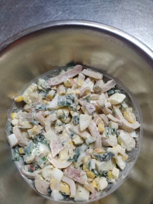С кальмарами. Обдать кипятком, в кипящую подсоленную воду, на минуту, не больше, станут резиной. Порезать, варенные 2 яйца, 1\4 яблока, кукуруза, укроп, зеленый лук, майонез.