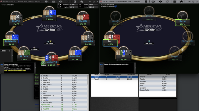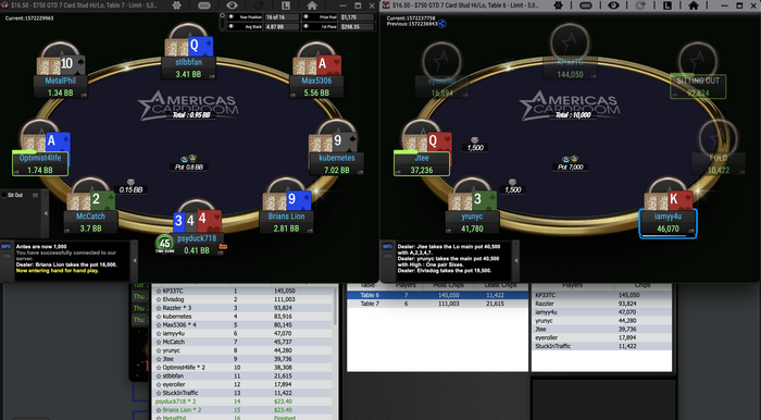 Еще раз о проблеме, я сделал два входа в турнир по $16,5, дошёл до 3 столов. Мой стол завис, соседние столы из этого же турнира работали нормально. Лобби работало нормально. Перезагрузка рума не помогла, перезапускал раз 5. В сит-ауте попал в призы, но остался в минусе баксов на 9-10.