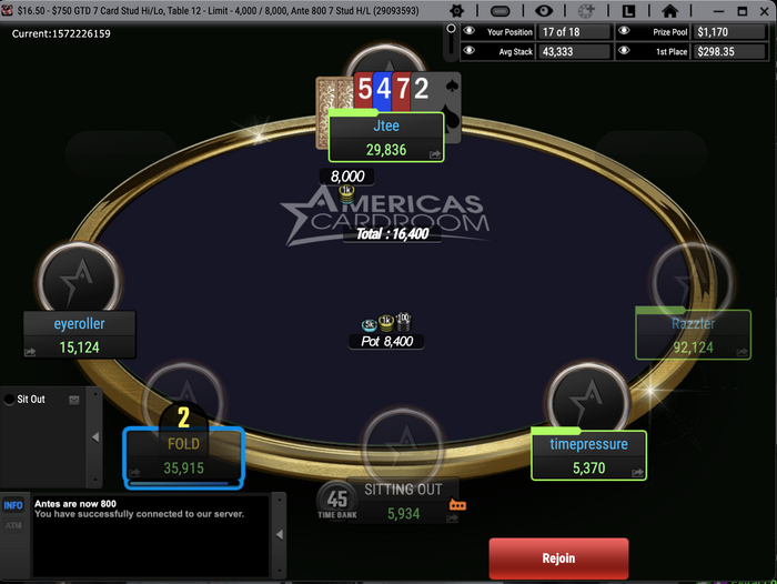 Регнулся два раза в стад8 за 16,5, кое-как дошел до 3 столов. У меня начал зависать стол, просто всё замирает и ничего не происходит. Открываю соседний стол, там всё нормально. Сажусь за кеш, всё нормально. Перезапускаю рум, открывается мой стол, я в ситауте и есть кнопка Rejoin. Жму на эту кнопку и стол зависает, если на неё не нажимать то игра идёт нормально, но я в ситауте. А потом вместо rejoin, появляется i am back, но стол продолжает висеть. Перезапускал рум раз 10. С интернетом все в порядке. Рум запускал с выключенным ВПН, турнир по 55 пло8 отыграл нормально. Соседние столы в этом же турнире работают нормально. Лобби турнира грузиться без проблем.