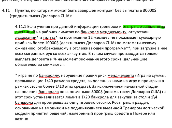 Неотыгрыш дистанции - это как минимум, почему этот пункт не применим и уже дальше можно закрыть его обсуждение. Если уже углубляться в доп. детали (хот это и не требуется ввиду прошлого предложения), то написано 12 месяцев, то есть речь шла о первых 12 месяцах обучения, и что у игрока должен быть прогресс (выигрыш не менее 10000$). Ученик был поставлен в известность об этом в устной форме.