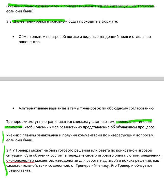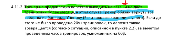 Натягивание пункта 4.11.2 как валидной причины для окончания договора, хотя это является прямым обманом. Я был на связи, отвечал на сообщения Алексея, а кучи пропущенных звонков от него или не отвеченных сообщений не было ни в ТГ, ни в Дискорде, ни в скайпе, ни на личный мобильный телефон (все эти контакты есть у Алексея). Аргумент, что я якобы ни о чем его не предупредил и пропал, хотя мы с Алексеем общались в ТГ и голосовыми и на созвоне и даже была тренировка в октябре (как только Алексей обратился) и были сделаны расчеты префлопа с залоком (таким, какой он попросил) в ноябре. Никаких других звонков от Алексея и не отвеченных сообщений не было. Я не понимаю, как человек, считает нормальным ссылаться на этот пункт договора, если знает, что я не пропадал, а это он не пытался выйти на связь, а как только звонил - я ему отвечал, в том числе проводил тренировку. Важный момент, что в конце лета у нас с Алексеем состоялся разговор, где было сказано: что играть он начнет в очередной раз с осени, а сейчас он отдыхает. Напоминание о катке и обязательствах по договору были восприняты эмоционально негативно. Видя это, я ему сказал: ок, будут нужны тренировки или какие-то вопросы пиши, звони мне – контакты знаешь.