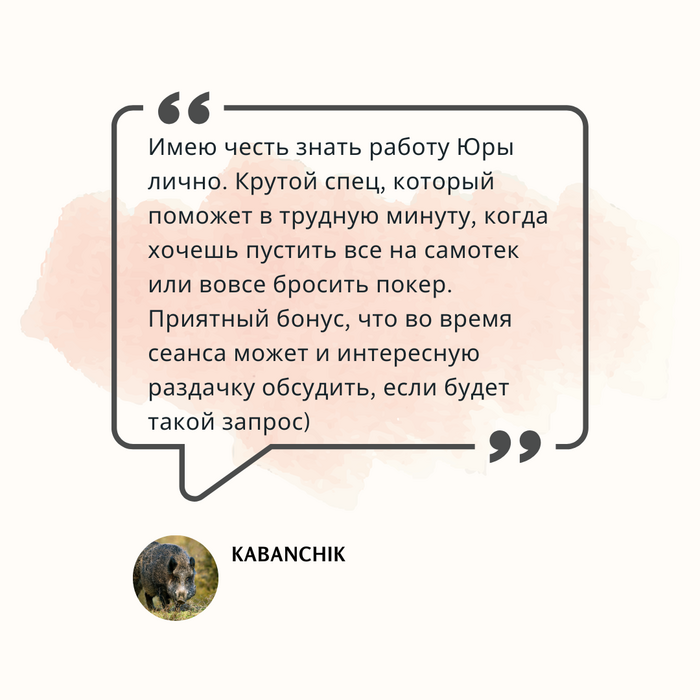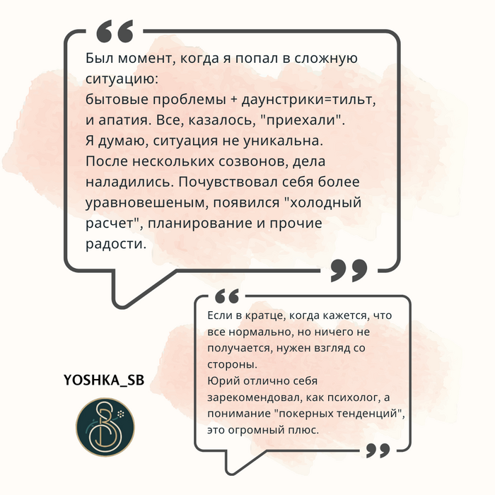 всем привет) хочу оставить свой отзыв о нашей работе с Юрой) как-то не так давно на меня напал пзц какой затяжной стрик, который привел к мега жесткому тильту(у меня такого не бывало за 4 года). спасибо добрым людям и меня познакомили с Юрой, и он реал помог мне выбраться из этой негативной ямы и мы до сих пор продолжаем с ним работу, я ему благодарен. спасибо Юра!!!