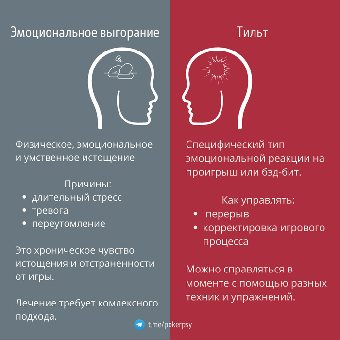 Эмоциональное выгорание не равно тильту. Ведь тильт — это временная эмоциональная реакция, с которой можно справиться, восстановив самообладание.