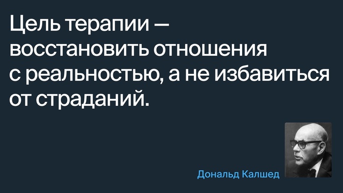 Психотерапия помогает воспринимать реальность с меньшими искажениями: отделять внутренний мир от внешнего, понимать истинные причины своих поступков, распознавать действие психологических защит, заблуждений, когнитивных искажений. Можно сказать, что терапия не избавляет нас от страданий, но показывает, из-за чего эти страдания возникли.