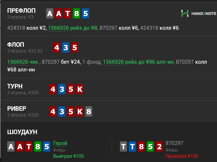 На лид мы спокойно коллируем, так как ну это ваще сильноя неубеваемая рука. На терне опп буквально ставит только трипс восьмерок, поэтому линия рейз меньше чем 3х для спр мне нравится больше чем кол и олын ривер, так как может отскочить. Короче, фигачим на кулервелью, что в данной ситуации оправдано из-за лимита и уровня игроков здесь. Ну и ловим такой кулер в нашу пользу, sick hand, добавить нечего.