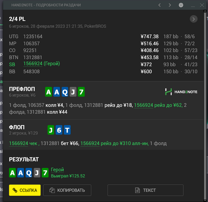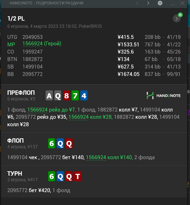 Флоп: скорее всего, я совершил ошибку, ну слишком уж у нас хорошая, я должен был сыграть кол, чтобы заманить телефонистого фиша, а таким он и является, но на пуш, очевидно, всякие гатшоты или дро даже он выкинет. Зато раздачу выиграл, могли подумать вы, но если я мог постараться выиграть больше, то это не очень хорошая раздача, несмотря на результат.