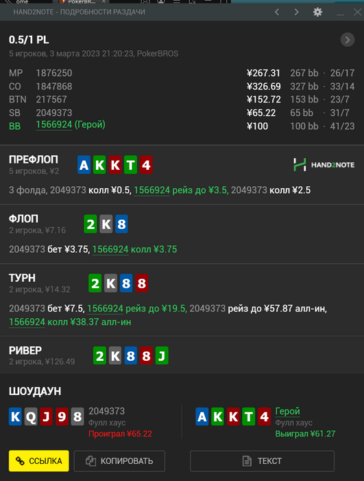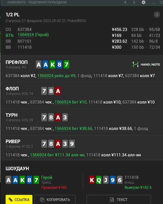 Вывод: играйте и пытайтесь находить в спотах как блефы, так и велью, умейте правильно соединять их в пазл и использовать с максимальной пользой. Играйте от души короче и не утоните в бесконечным бессмысленным гриндом)