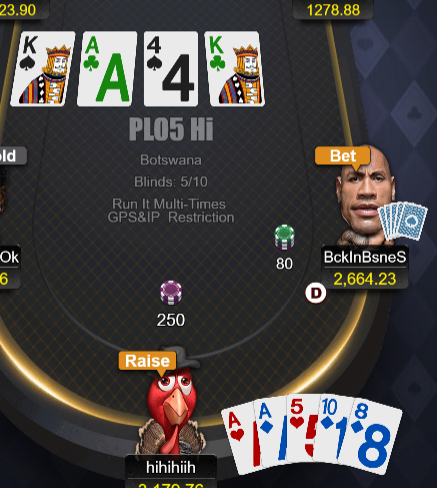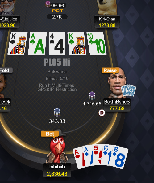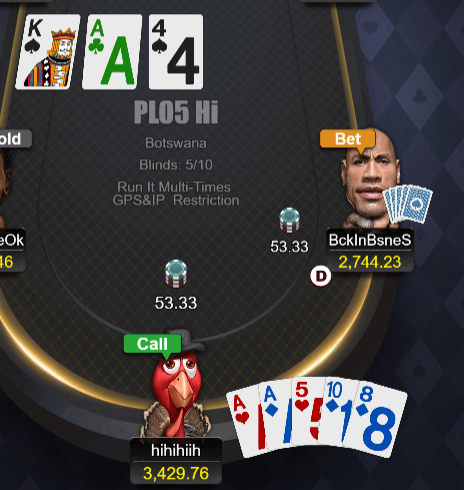 Флоп: я тут могу использовать разные сайзинги, но не меньше полупота, кои я и поставил, кнч можно и больше, и, возможно, будет более правильная игра, но я скорее хочу оставить у себя в ренже больше нац фд, а в сайзе в пот или около того, будут только тузы с фд, коих по комбинаторике меньше, чем обычных туз икс фд. Получаем рейз стандартного размера: в 3х, не в пот, как любят делать некоторые непонимающие игроки. Крутить дальше мы в теории можем, но уж слишком большой сплит сайзов уже произошел на флопе , чтобы придумавать трибеты на флопе в омахе в блеф, чтобы иметь право поставить так с королями. К тому же слишком динамичная доска, чтобы королей пихать, к тому же туз флешовый может помочь блефануть по некоторым ранаутам.