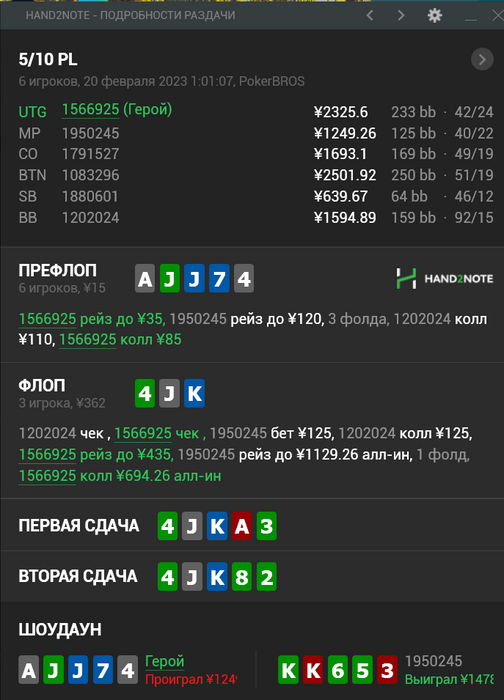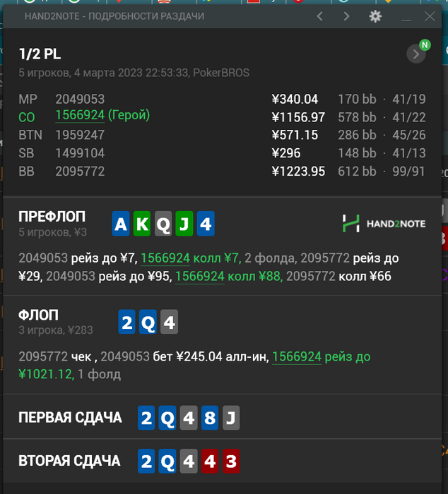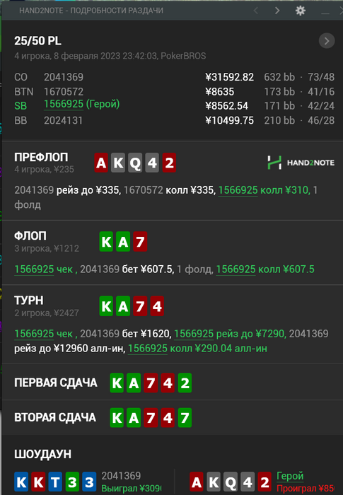 Префлоп я играю лимп, из-за впипа, рука открывается в дабл сьют вариантах, хорошая игра (себя не похвалишь, никто не похвалит :) ), ну и колится на рейз соответственно. На наш чек получаем крупную ставку: рейзить смысла нет, так как изолируем себя от доминированных рук, рейзить 3х тут нужно на мелкую ставку до одной трети или около того. Играем дисциплинированный кол и терн сказка: у нас появилось фд + он точно потнет со своими дро + две пары. В нас летит пот, мы олын, все по сценарию. Опп кнч тут решил показать кунг-фу, и его кунг-фу оказалось сильнее. С его стороны это полное переигрывание руки от сайзинга на флопе, до кола олына на терне.