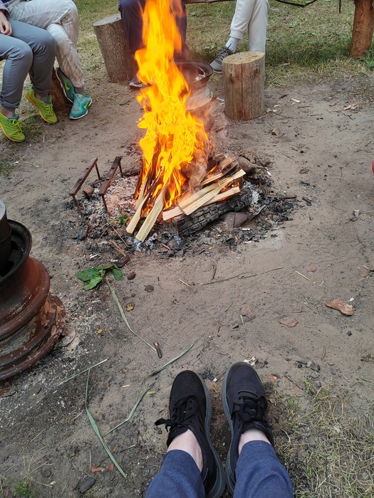 Пока мы ставили палатки, встречающие, Саша и Жанна, тоже люди от организации, приготовили бомбезный ужин. Уху и плов. Накрыли на стол овощи, хлеб, напитки. Так же уже бурлил котелок с кипятком и можно было заварить себе чай или кофе.