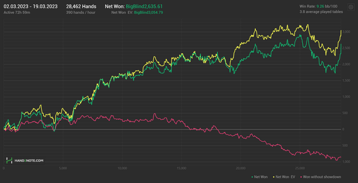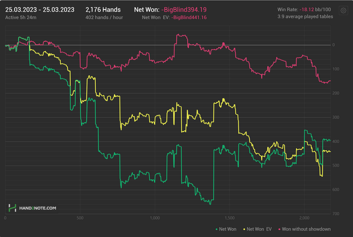 Но никуда же не делись психологические проблемы(мой образ жизни уж точно этому не помогал, а с точностью наоборот). Очень вовремя подоспела всеми любимая диспа, улетел на 52би по факту, по ев 28. Больно. Эти сраные мысли что я уже ближе к бомжу, чем к покерному про. Рассчеты на сколько хватит накоплений если уменьшить траты, на сколько если я с такой же скоростью буду заливать. Ну вы знаете)