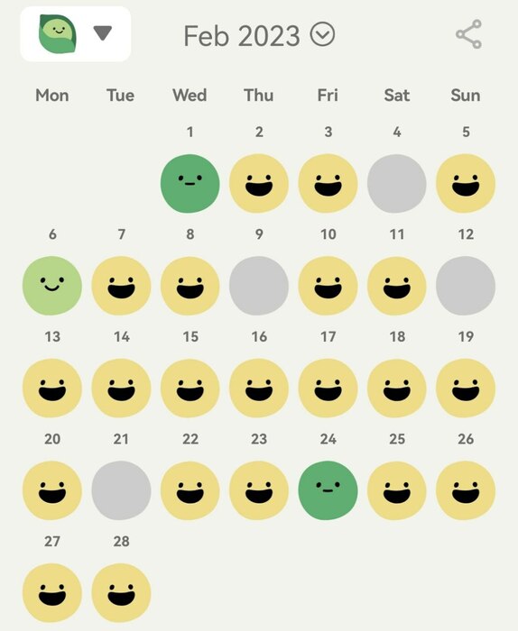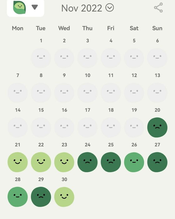 Скрины с аппки, где замерял настроение. В марте всего неделю отмечал, там все топ и в моих днях теперь мало изменений, а настроение всегда топ. Чем светлее мордашка, тем лучше. Не знаю какую именно роль АД играют в этом, но в начале года подняли до максимума - 20мг. Странно совпадает с моим переездом в Тай. Сейчас образ жизни намного улучшился. Я уже сказал психотерапевту что хочу пректатить, выходит пол года пью. Его же совет - пропить пол года именно с момента, когда начало действовать. Ну удачи!)