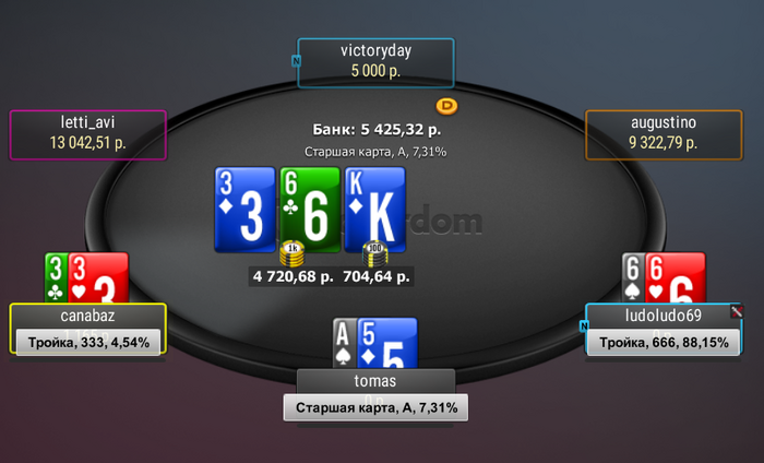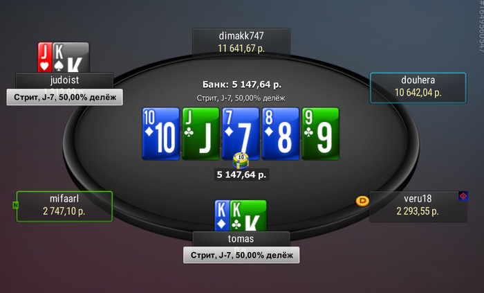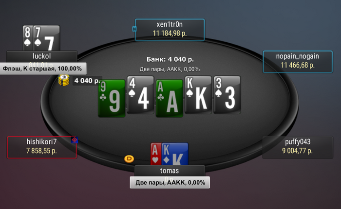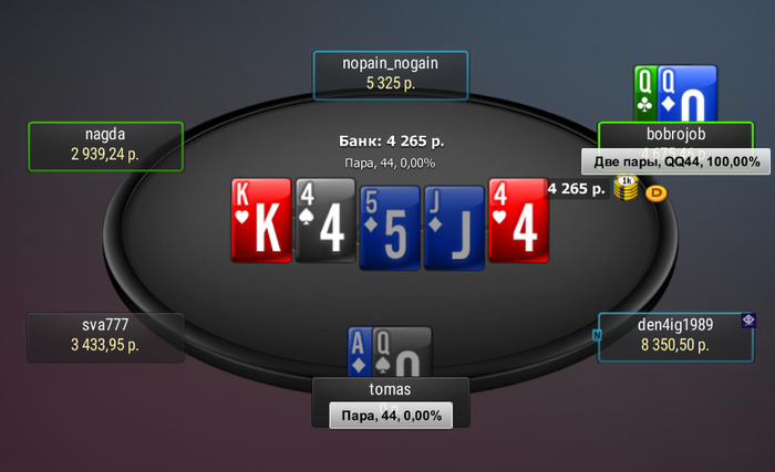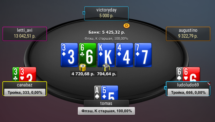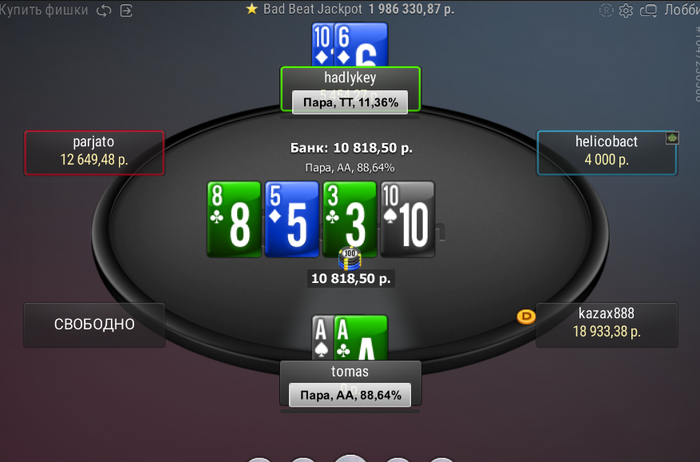 Раздачи я конечно выигрываю, вот видишь, даже с тебя рублей 500 нажил в монетке {1}, а в следующую раздачу проиграл 5 000 поехав в 95 % эквити, и вроде половину из вышеуказанных раздач выиграл, а вроде и в - 4 500 иду.