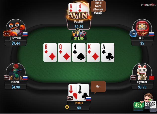 У него мало рук было на тот момент, впип там около 20 и он очень отмороженно играл в плане 3бетил меня с хламом ( показывал руки ) на двух столах видел его шоуданы, от там что-то типо К хай ставил овербеты в блеф