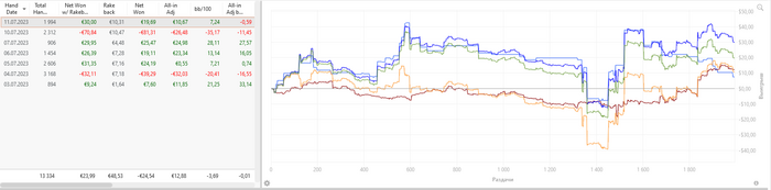 День 4. Фууухххх. Наконец то можно выдохнуть. Решил блог вести и по закону подлости начало оказалось смазанным в плане игры. В первые дни сначала математика подвела, затем поупирался в натсы от фишей, затем какое-то муторное дрочево туда-сюда в результате которого все таки смог вывести EV к нулю. И вот сегодня, наконец-то, пришло все в относительную норму. По сути первый спокойно сыгранный день, который не таил в себе сюрпризов. Жалко только поработал мало, всего 2 часа. Очень много времени провожу на улице. Лето все таки, надо гулять.
