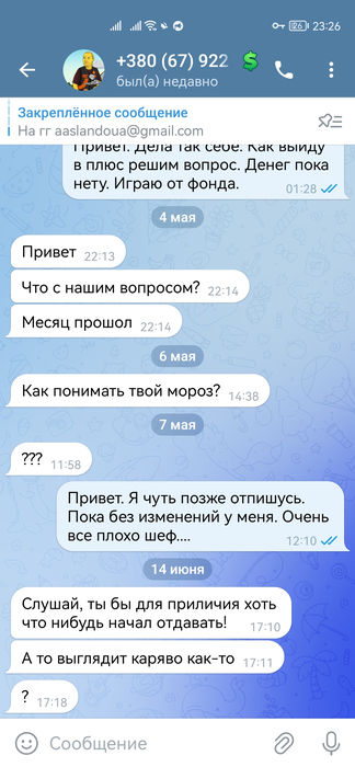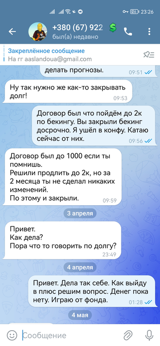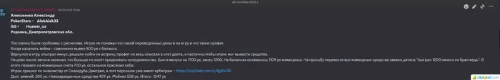 nefedoff, что касается данного комментария, то в данном случае мы разошлись без притензий ... Переписка так же вся сохранена... Я сам обьявил о том что выхожу из фонда , по той причине, что не мог больше отыгрывать более 300 турниров в месяц ... Ничего не имею против этих ребят очень хорошие люди . хорошая добрая конфа.. Но вышел так как на то были свои жизненно необходимые обстоятельства. Все посчитали погасили что было по кассе и разошлись как в море ⛵....