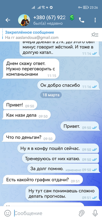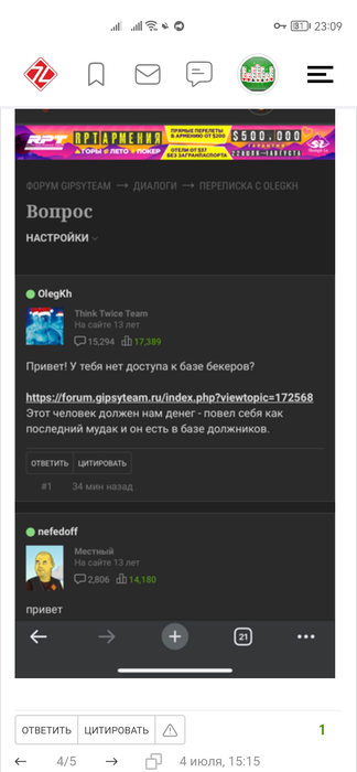 OlegKh, я тоже сейчас приложу скрины где ты сказал мы тебя опускаем, претензий не имеем . Когда будет желание в любое время возвращайся типа. Мол что за причина ухода итд.. И перевода денег, на твой счёт .или команды . С двух румов пс и гг. И какого хуя ты тут проявляешь ...без доказательств и конкретной причины. Ты мало нажил когда я был в команде ? Учитывая тот факт , что ваш фонд не имел никакой тренерский базы ,не было никакого материала для развития как игрока итд.. напиши сюда свой номер теллеги и обоснуй долг. Какого хрена под моим именем всякие чушпаны оставляют грязные комент в без доказательств !!!???