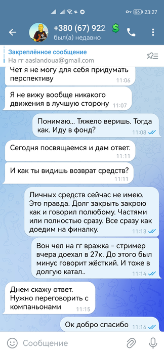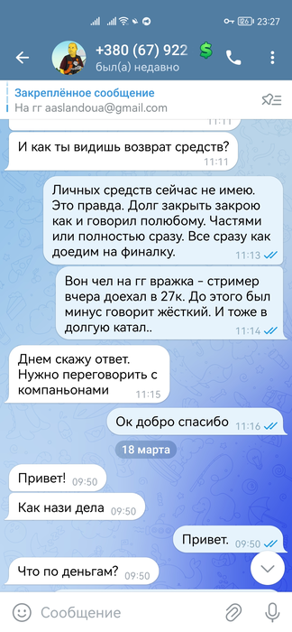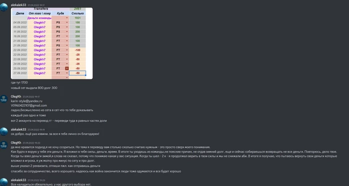 Вот в этом коменте все чётко видно. Где ты говоришь мне в Дискорд :"Спасибо за сотрудничество всего хорошего." А если был долг, или конкретная претензия, то ты так бы и указал на это правильно ? Но я точно помню что мы разошлись с тобой по доброму и без всяких проблем . Я вернул часть средств которые у меня были на счетах.