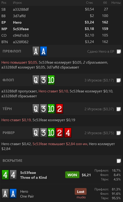 mr_yazlo, спасибо за разбор. Мысли здравые, но я исходил из соображений, что товарищ тянет дро на флеш или на стрит, ну и топ пара со средним кикером. Подумалось на ривере, что он, заталкивая огромный стек, промахнулся в итоге, ведь выбить оверпару таким мувом более чем можно.