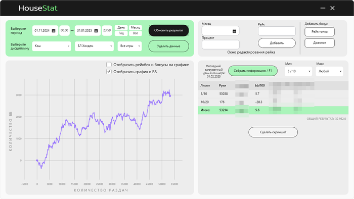 Всем привет! Обучаюсь у Виктора, хочу рассказать о резалтах работы. Конечно, выборка мала и за 3 месяца можно было отыграть больше, но у меня еще где то 10к на других румах, но на общий итог это не влияет. Результаты от 1 ноября, так как начал обучаться в конце окт.24. показывают мужчинские 5,7 бб / 100 преРБ